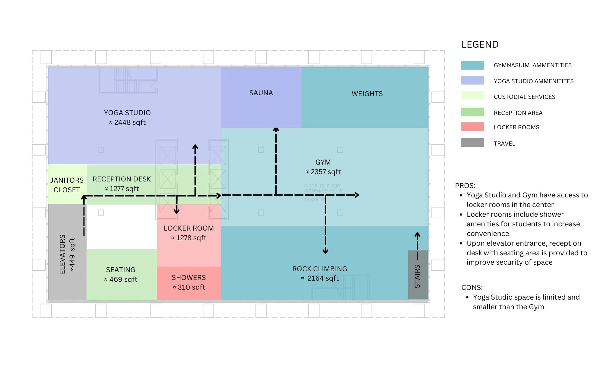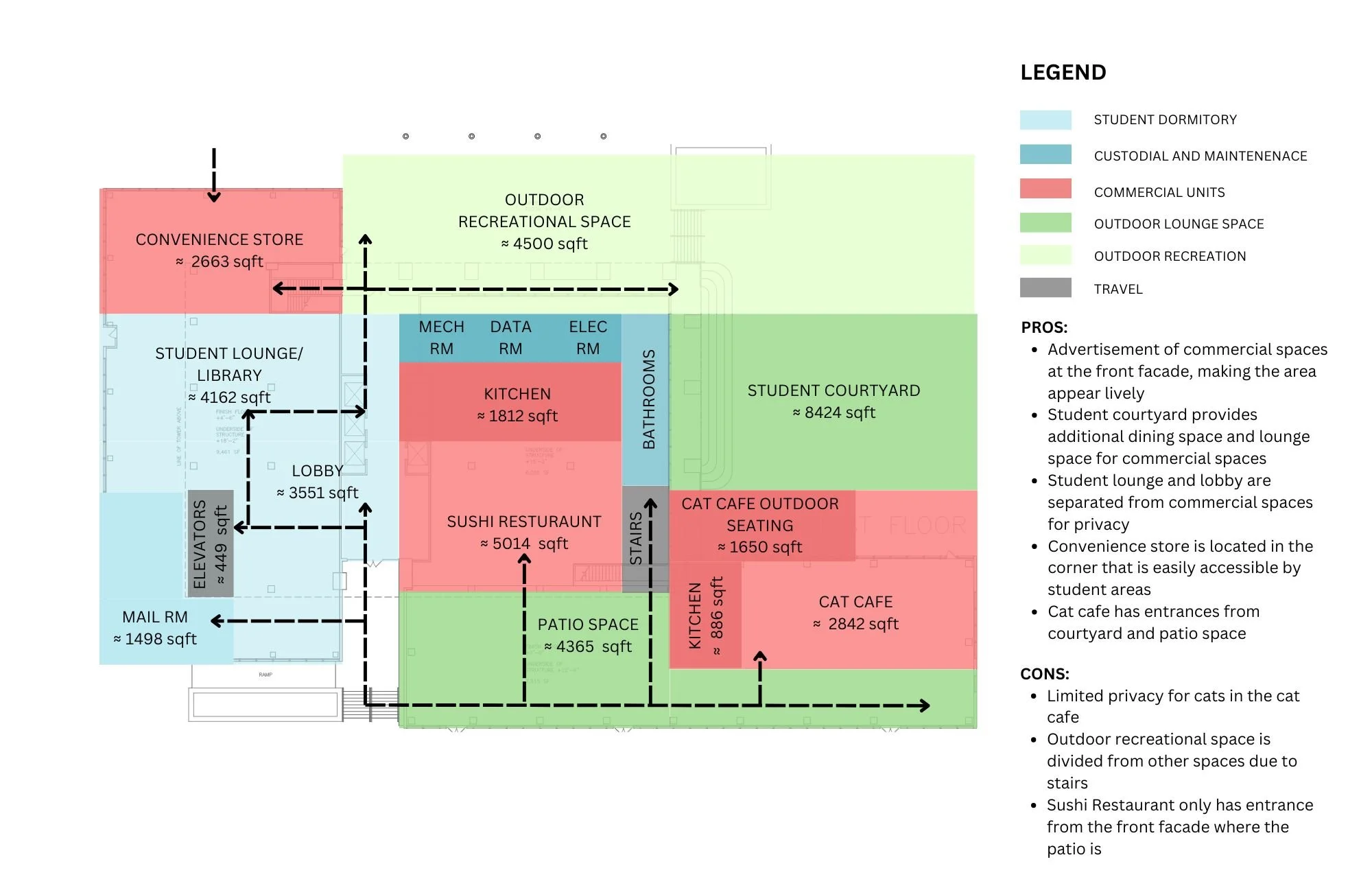 Rendered/Colored Floor Plans for the cat café, lobby, and gym space.